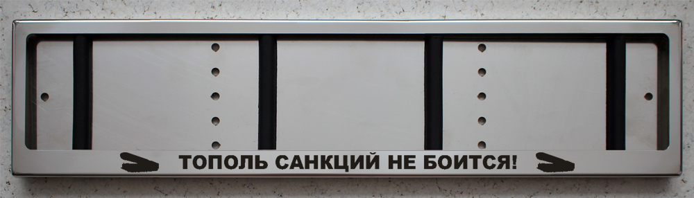 Рамка для номерных знаков изготовлена из аустенитной нержавеющей стали марки AISI 304 с зеркальным финишным покрытием и надписью "ТОПОЛЬ САНКЦИЙ НЕ БОИТСЯ!" в нижней части.