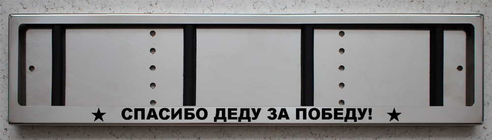 Рамка для номерных знаков изготовлена из аустенитной нержавеющей стали марки AISI 304 с зеркальным финишным покрытием и надписью "СПАСИБО ДЕДУ ЗА ПОБЕДУ!" в нижней части.
