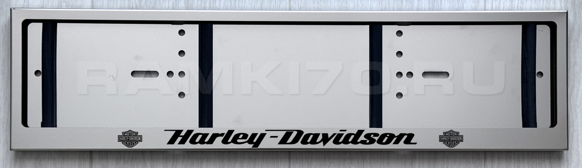 Черная надпись Harley-Davidson и логотип Harley-Davidson наносятся на рамку лазерной гравировкой, стойкой к природным воздействиям. Надписи Harley-Davidson и логотип не смываются и не стираются. Металл не прорезается, поэтому надпись сделана фирменным шрифтом.