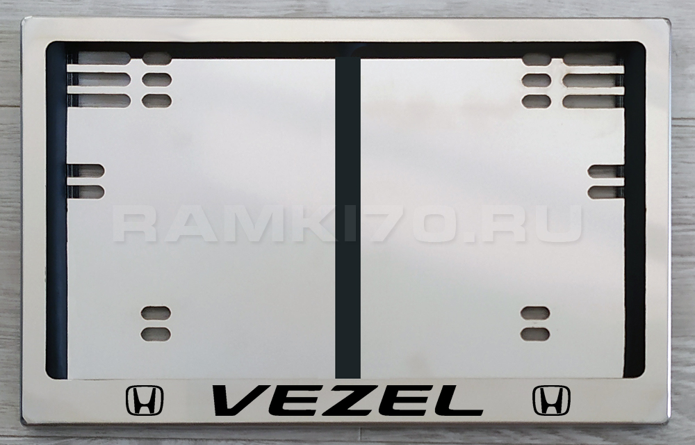 Черная надпись и логотипы VEZEL наносятся на рамку лазерной гравировкой, стойкой к природным воздействиям. Надписи и логотипы не смываются и не стираются. Металл не прорезается, поэтому надпись сделана фирменным шрифтом.